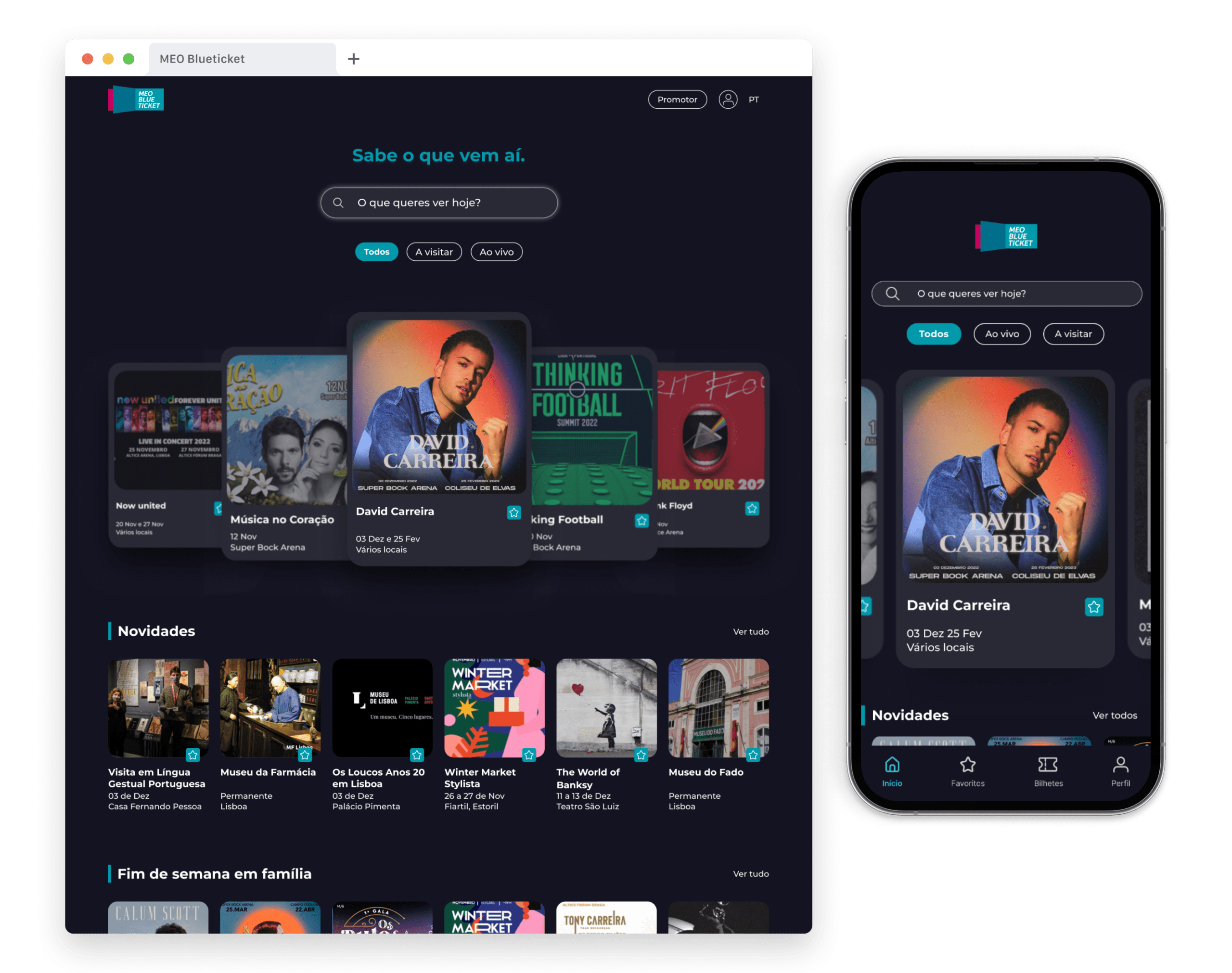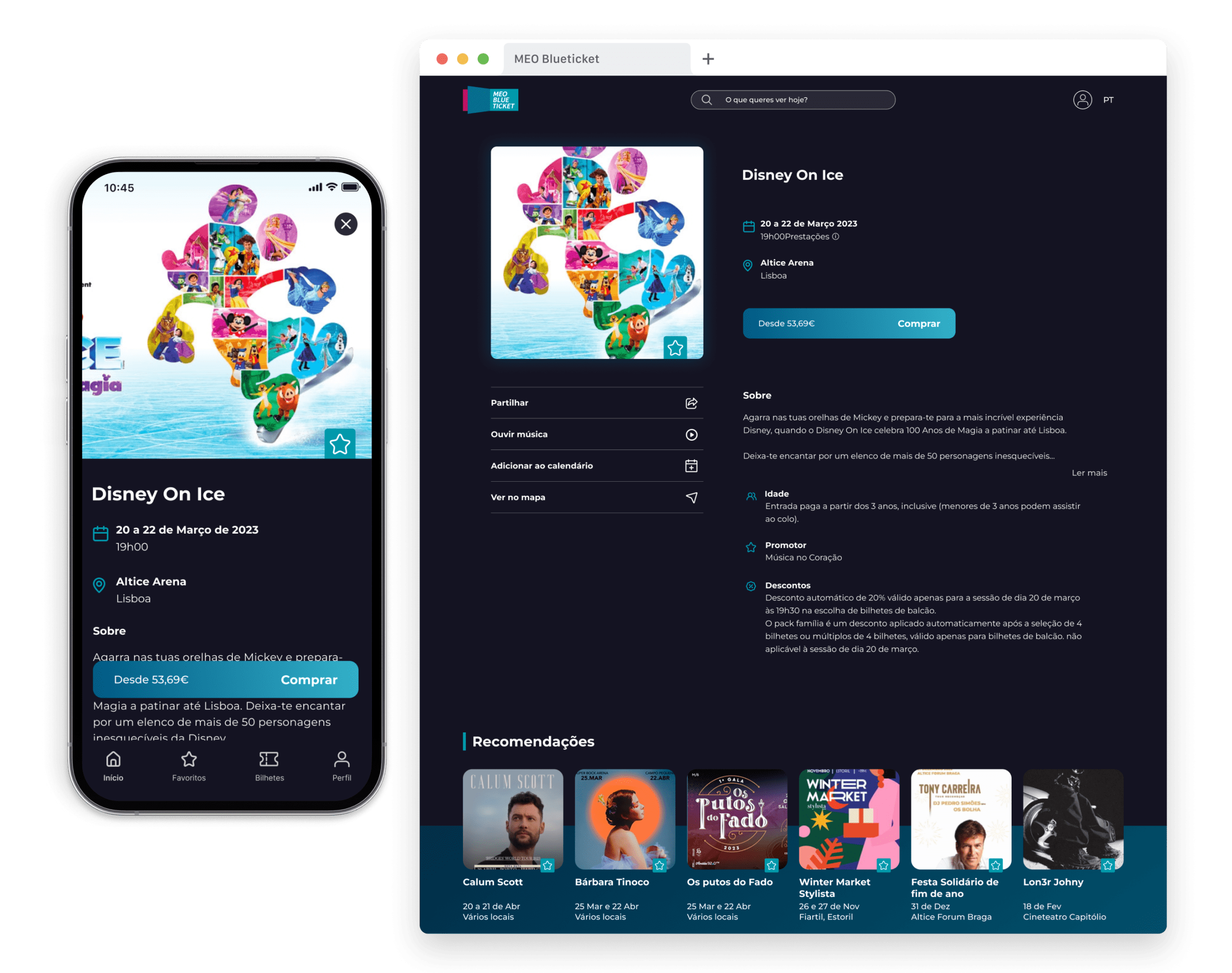 MEO Blueticket is an online ticketing platform for live events, concerts, exhibitions and monuments. When I joined the project, the UX research and core flows were already defined. My role focused on designing the visual interface aligned with the Blueticket brand and creating a scalable design system for both the website and app.